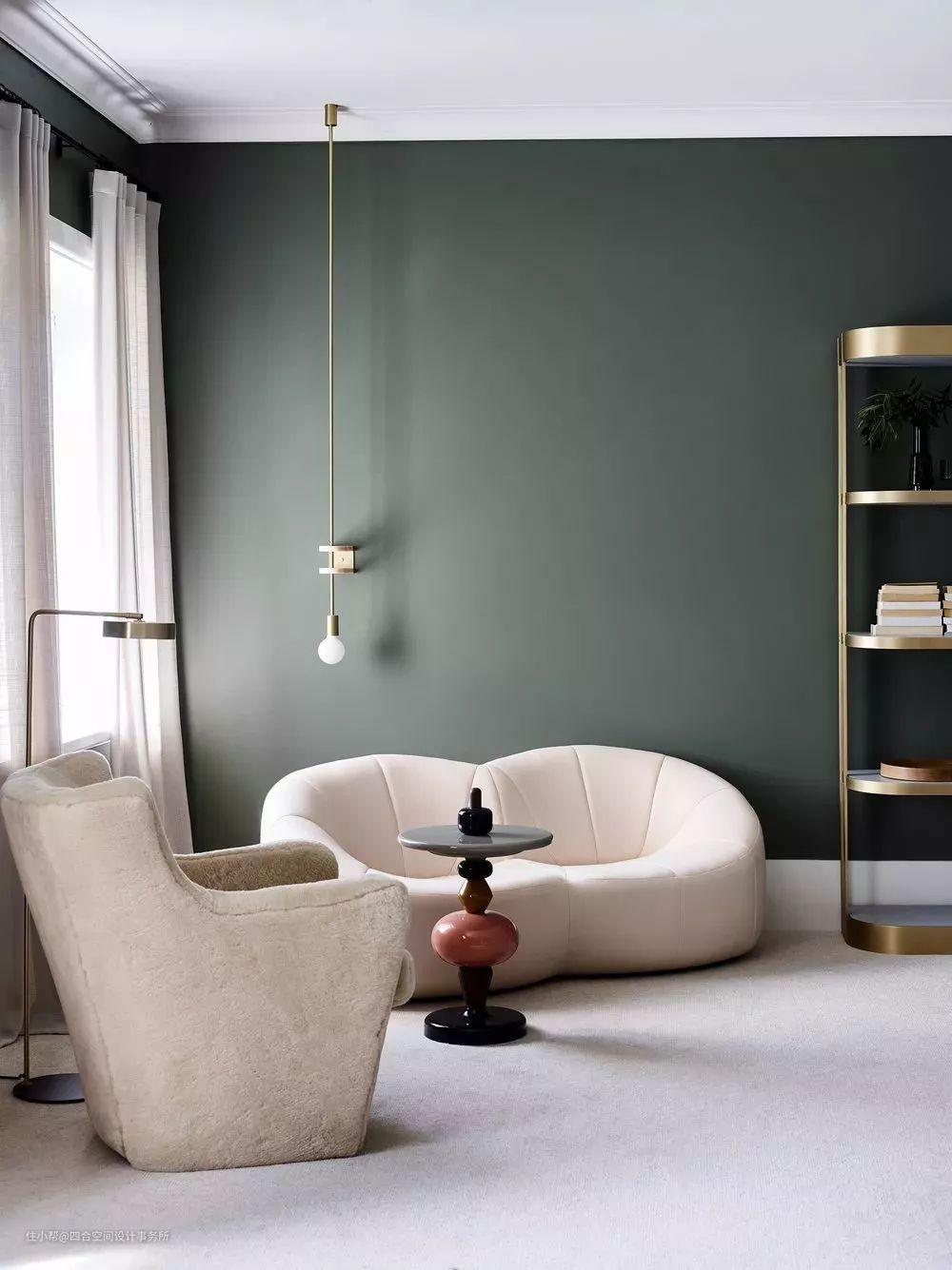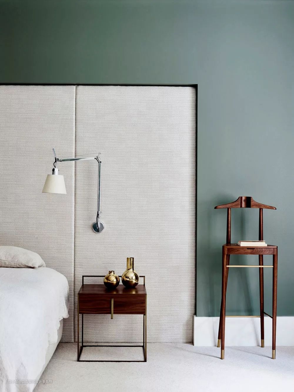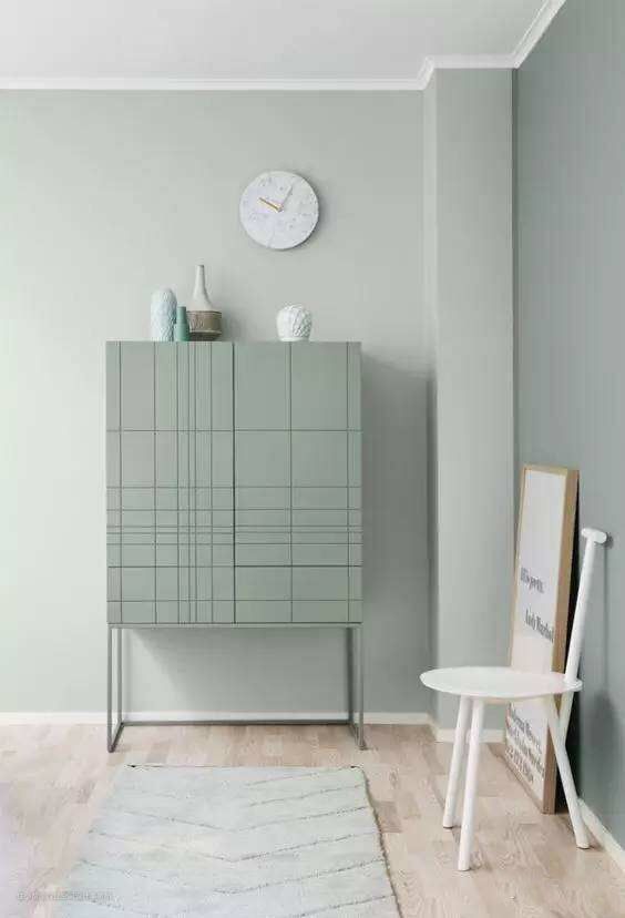 2、灰豆绿--虽说绿色是充满生命力的颜色,但过于明亮的草绿或是稳重端庄的祖母绿,若大面积运用于家具配色,或是太过眨眼,或是过分压抑。而灰豆绿却像是被蒙上了一层神秘而又梦幻的薄纱,将欢快跳跃的情感微收内敛,却又不至过分稳重不易亲近,而将春日的温柔淡雅体现的淋漓尽致。如果说绿色不好搭配,那灰豆绿恰恰因为蒙上了那一层神秘的灰色,而称为百搭的色系之一。