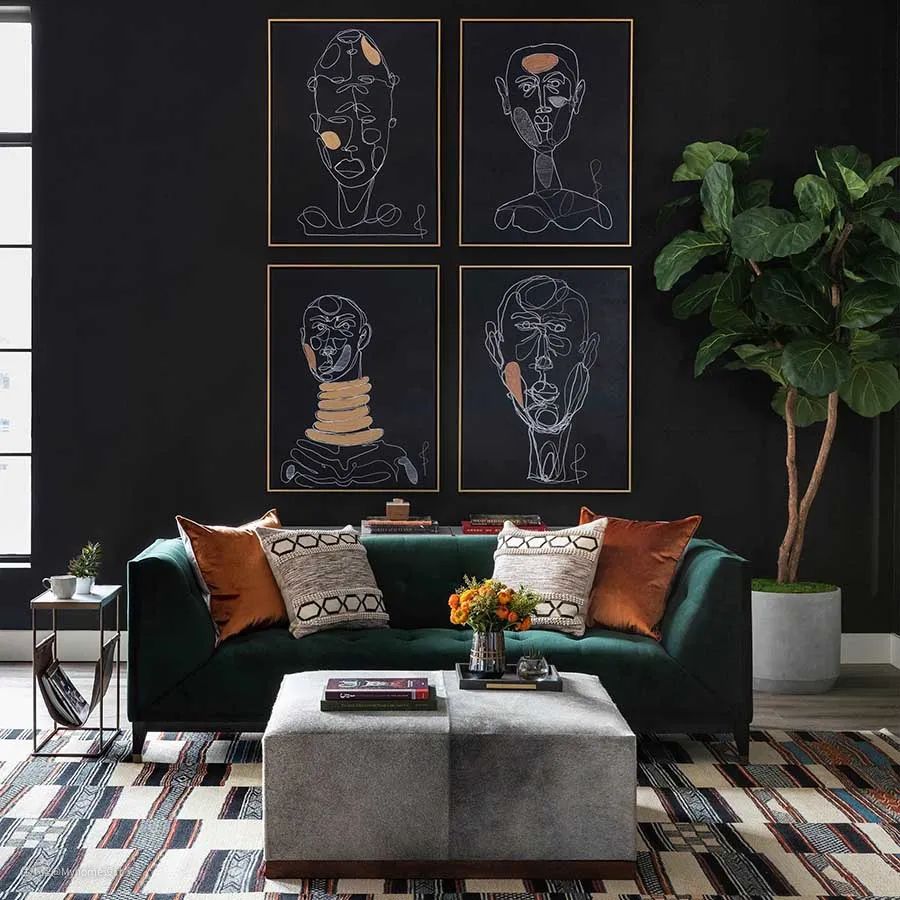 装饰画下方若有大型家具(比如沙发),记得画作的中心点要对齐家具中央处(中线);因为唯有居中摆放,才不会出现偏倚、不平衡的情况,进而达到美化效果。