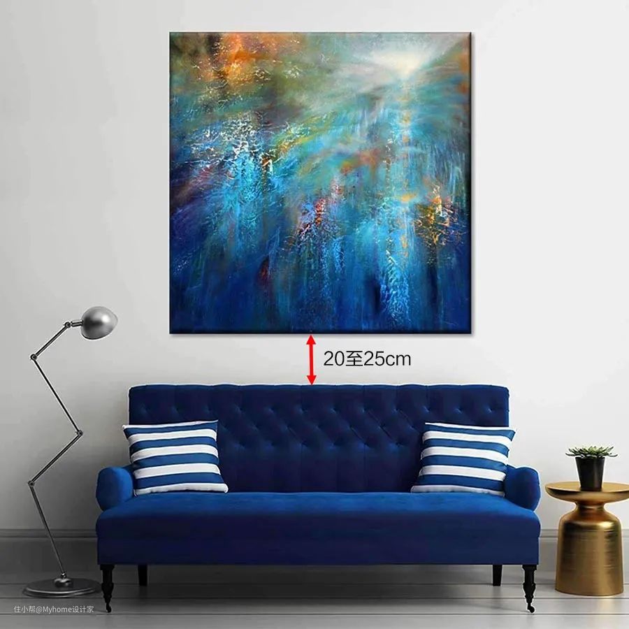 除了注意宽度,装饰画与沙发的距离也要留意;因为,一旦画作挂得太高,会显得"漂浮"在沙发上,而不是与沙发相连,整体感变得不协调,甚至变得突兀。