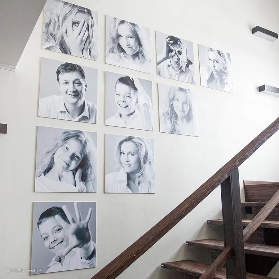 楼梯墙面也是装饰画经常悬挂的位置;建议操作时,先画出一个隐形的梯形框,由高而低分别悬挂,就能创造墙面的律动感。特别提醒,悬挂上排装饰画时,各画框的上缘处应尽量靠齐梯形框的上方,彼此之间不要落差太大,才不会显得混乱。