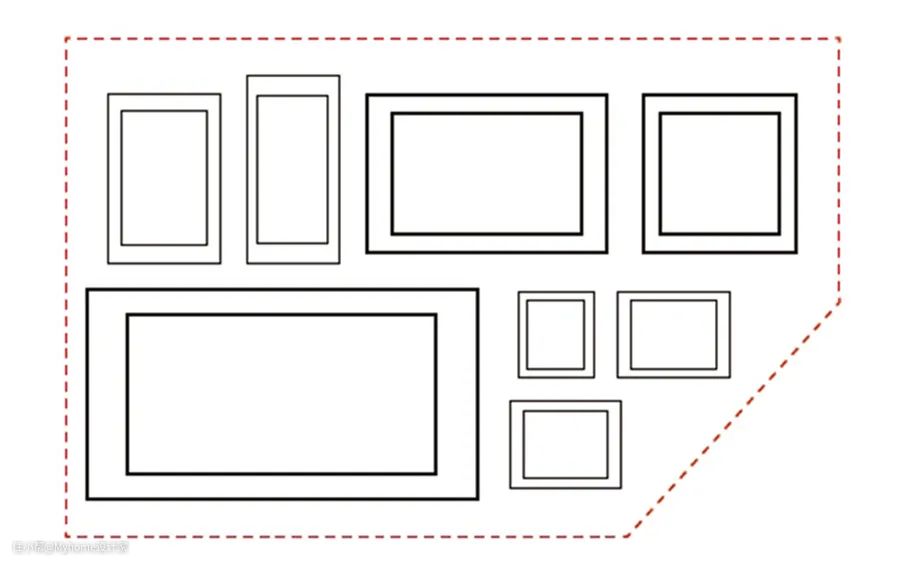 若是家中有奇葩角落或特别狭窄的空间,就适合运用此法。操作时,先画出一个隐形的矩形或长方形区块,将装饰画置入这个隐形框内,但不要超出框架,应整齐贴着框架线条,就能挂得好看又不显凌乱。