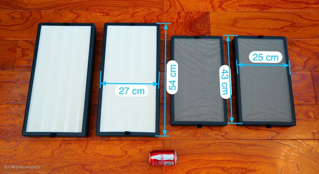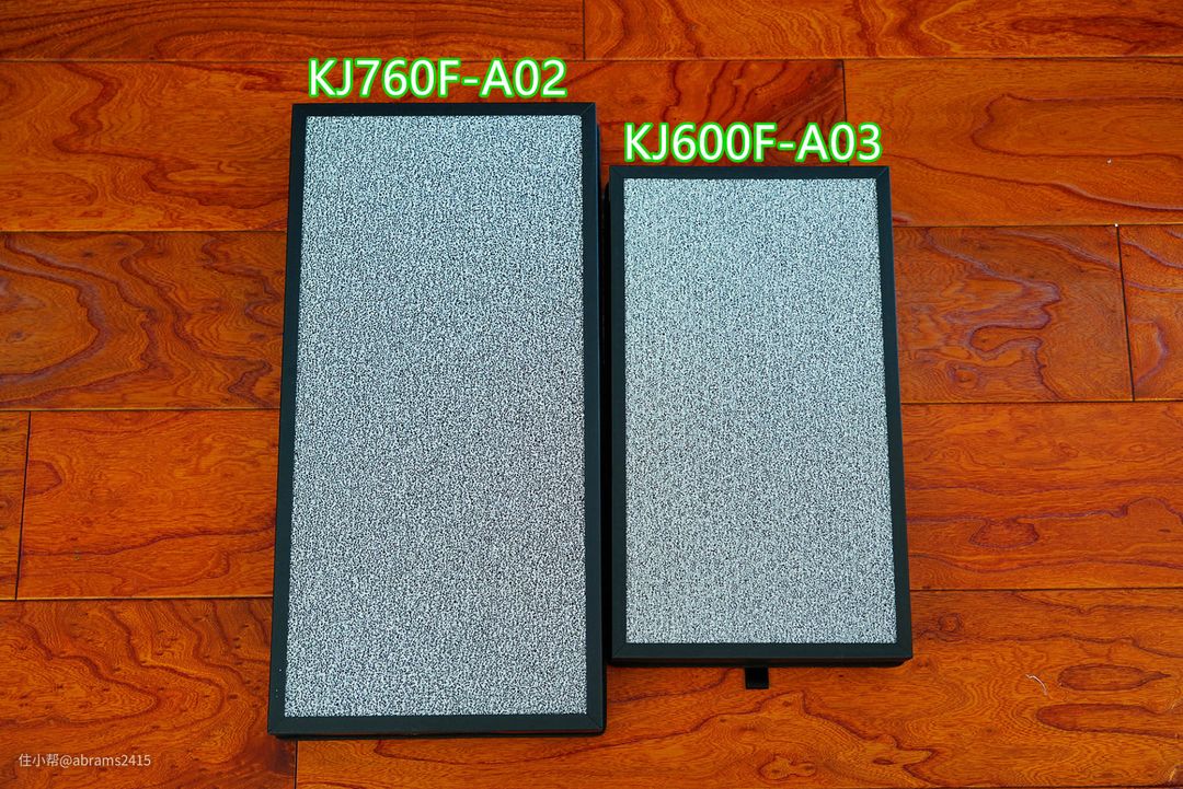 ▲一大一小两款空净滤网大小对比。虽然KJ600F-A03的滤网面积比KJ760F小。但颗粒物和甲醛CADR值依然强悍。甲醛CADR甚至超过了airx A7的200m³/h,要知道airx A7两侧滤网内填充了足量的活性炭