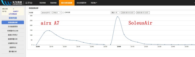 ▲我DIY的其中一台空气检测仪能联网并记录数据上传服务器。从平台导出数据并分析后可得出: 舒乐氏KJ760F的颗粒物CDAR值800m³/h所取得的净化效率确实比airx A7颗粒物CADR值700m³/h效率来的高的多