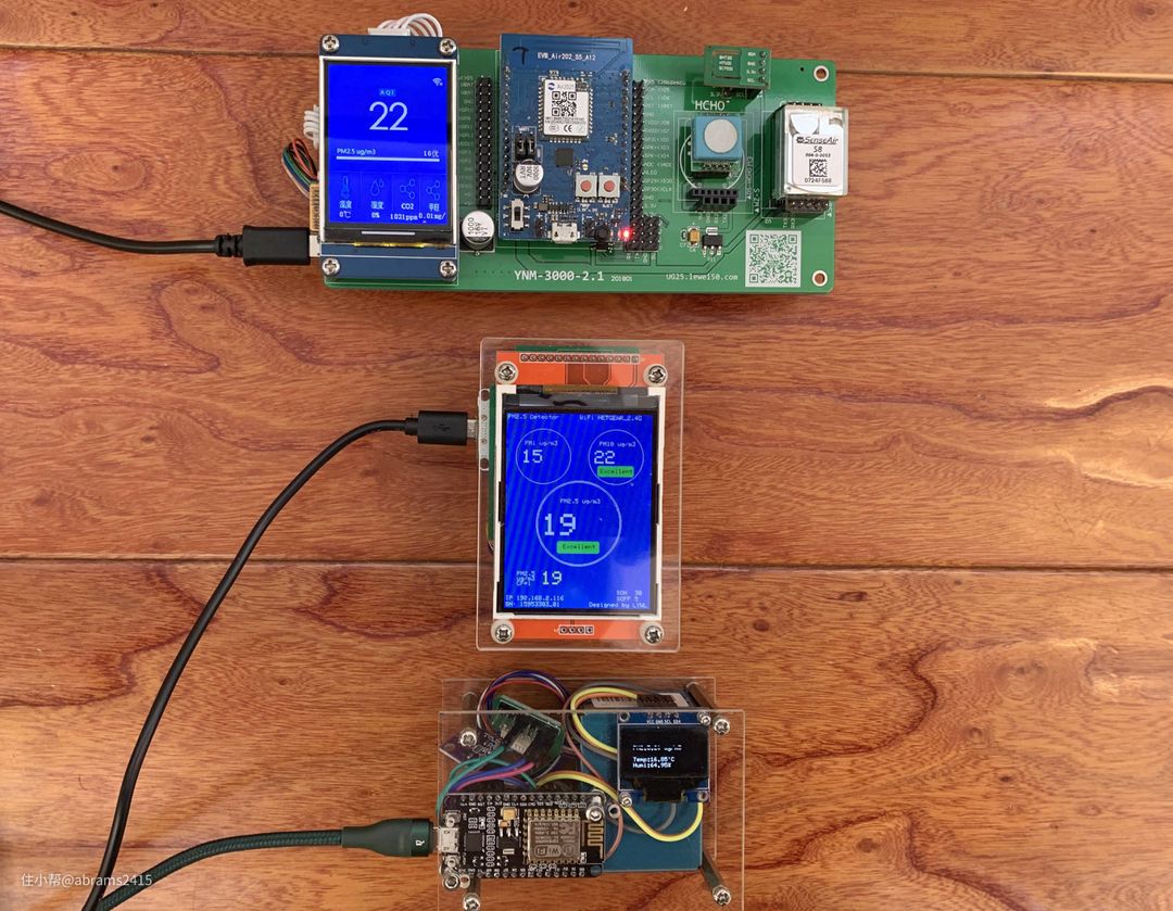 ▲手里三台自制空气检测仪+舒乐氏。它们的数据分别是: