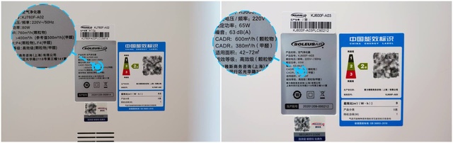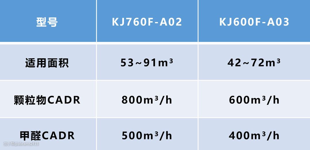 ▲两款具体参数区别我做了一张对比表,可见尺寸更小的KJ600F-A03更适合大卧室、宝宝房、书房、等空间使用。而KJ760F-A02更适用于全屋大空间空气净化