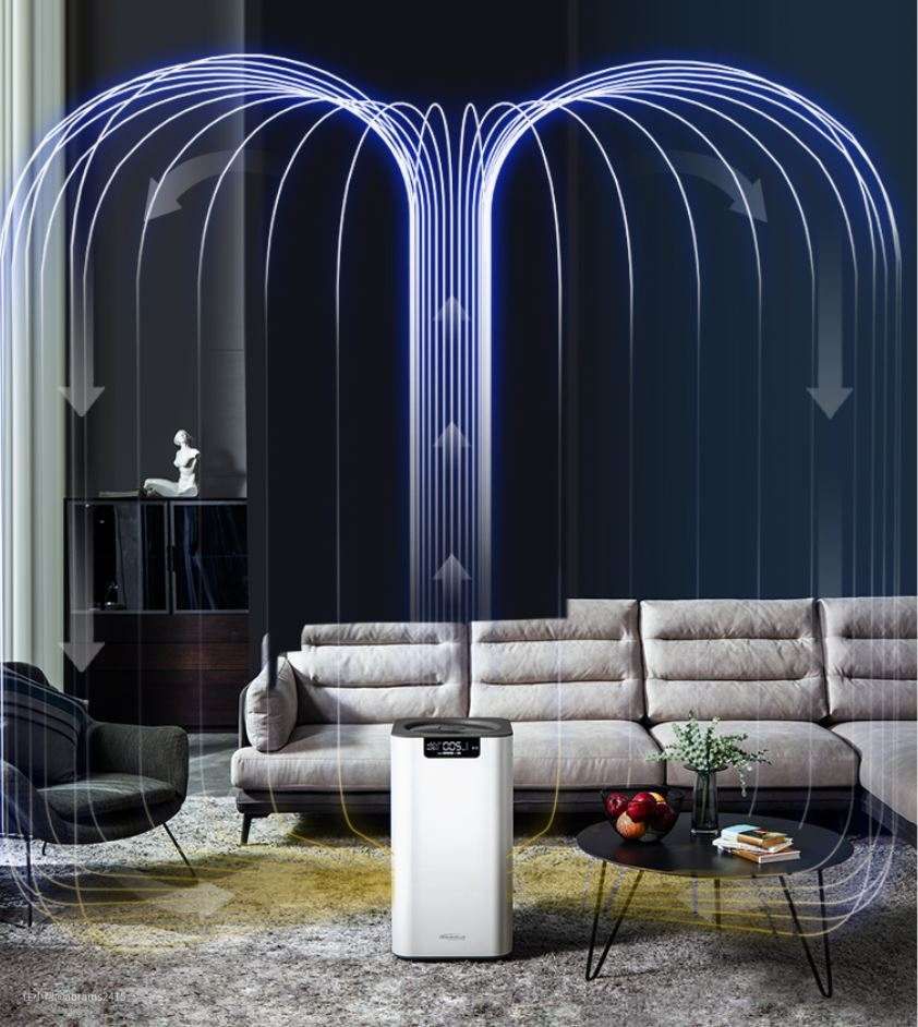▲舒乐氏空气净化器的顶置送风方式能净化室内空气的同时,增加室内空气流动。在开空调时能有效把暖气均匀的分布到室内各个角落,间接地也能节约空调用电。一举两得