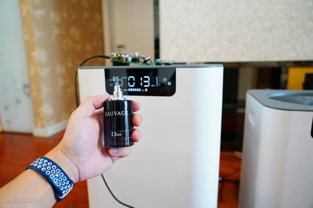 ▲用香水喷洒在空气净化器周围,因为香水中含有酒精。很多精度较差的电化学甲醛测试仪就会误认为是TVOC挥发物质。而舒乐氏两款空净内置的甲醛测试仪经实测不受干扰性气味影响