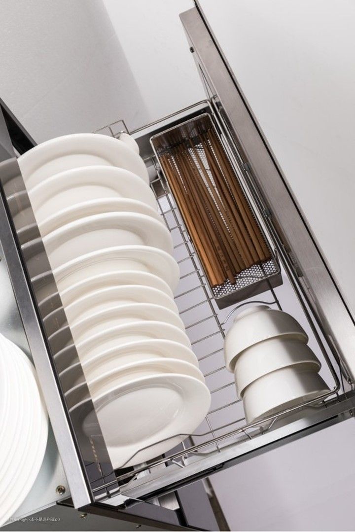 消毒柜不工作时就可以摇身一变,成为一个碗筷储存柜。目前市面上很多消毒柜的碗架布局设计都很不合理,布局比较单一,空间比较狭窄,不适合中式厨房的使用习惯,比如中国家庭常常会使用的鱼盘就很难在消毒柜中存放。而单一的横向卡槽更适合存放西式平盘,摆放中式深盘时由于不稳定,在抽拉过程中碗碟易发生碰撞现象,很不方便。