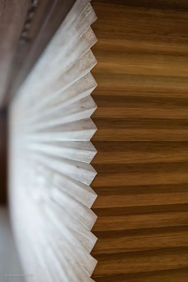 橱柜的外柜体用胡桃木包裹,打造出锯齿状造型,产生漂亮的光学阴影。加上灯带点缀,非常精美。