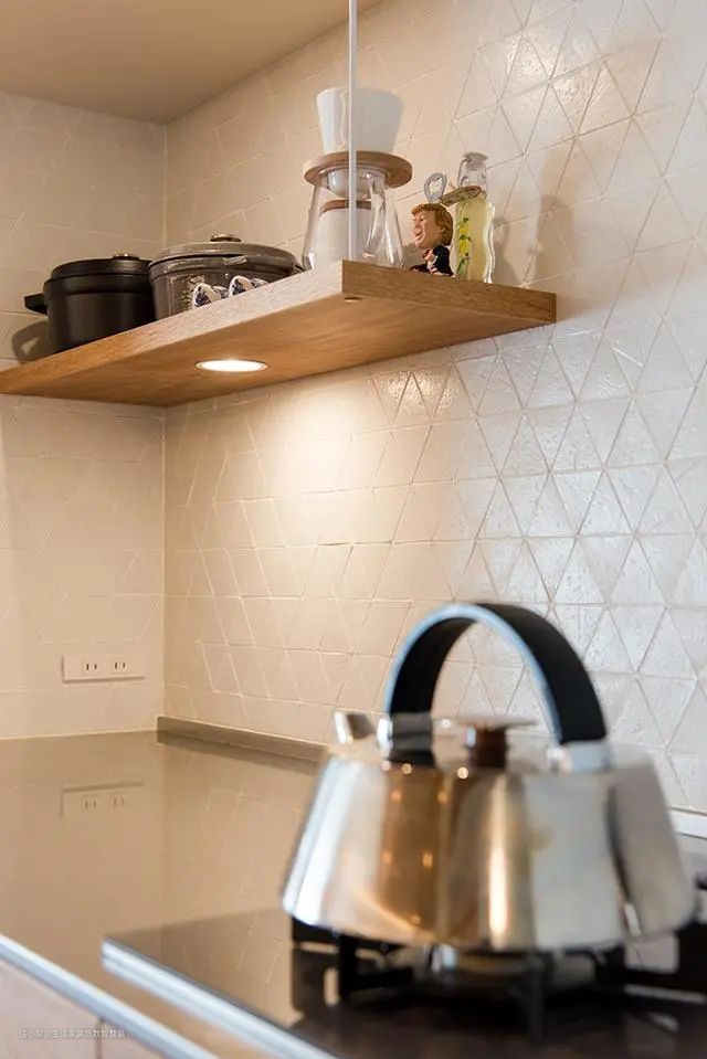 烹饪区的墙面用到了白色的纯手工三角瓷砖,看似朴实复古,其实材料费安装费都不低,呈现出来的效果很棒,有种年代感,让家更有文化气息。