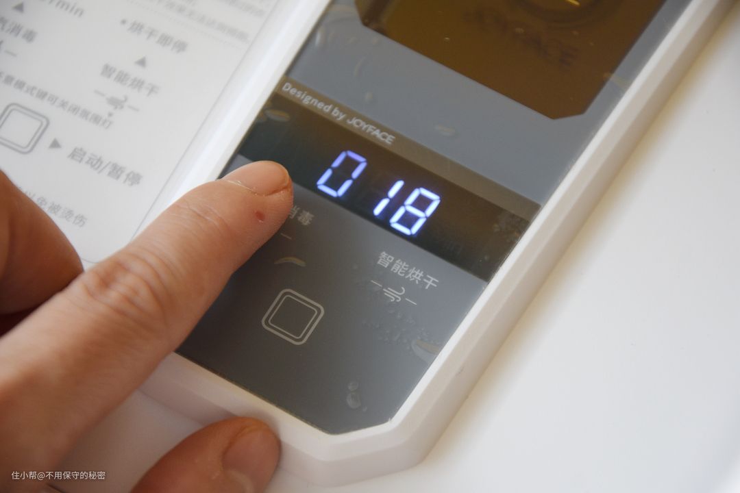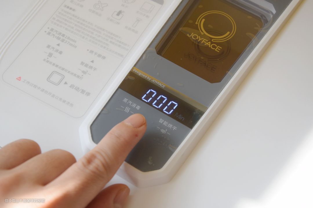 有烘干和消毒两种模式可选择,可以分开使用,也可以叠加使用。蒸汽消毒有两个档位,分别是18min(17min蒸汽消毒+1min冷风散热)和37min(17min蒸汽消毒+20min 70℃暖风除湿)。