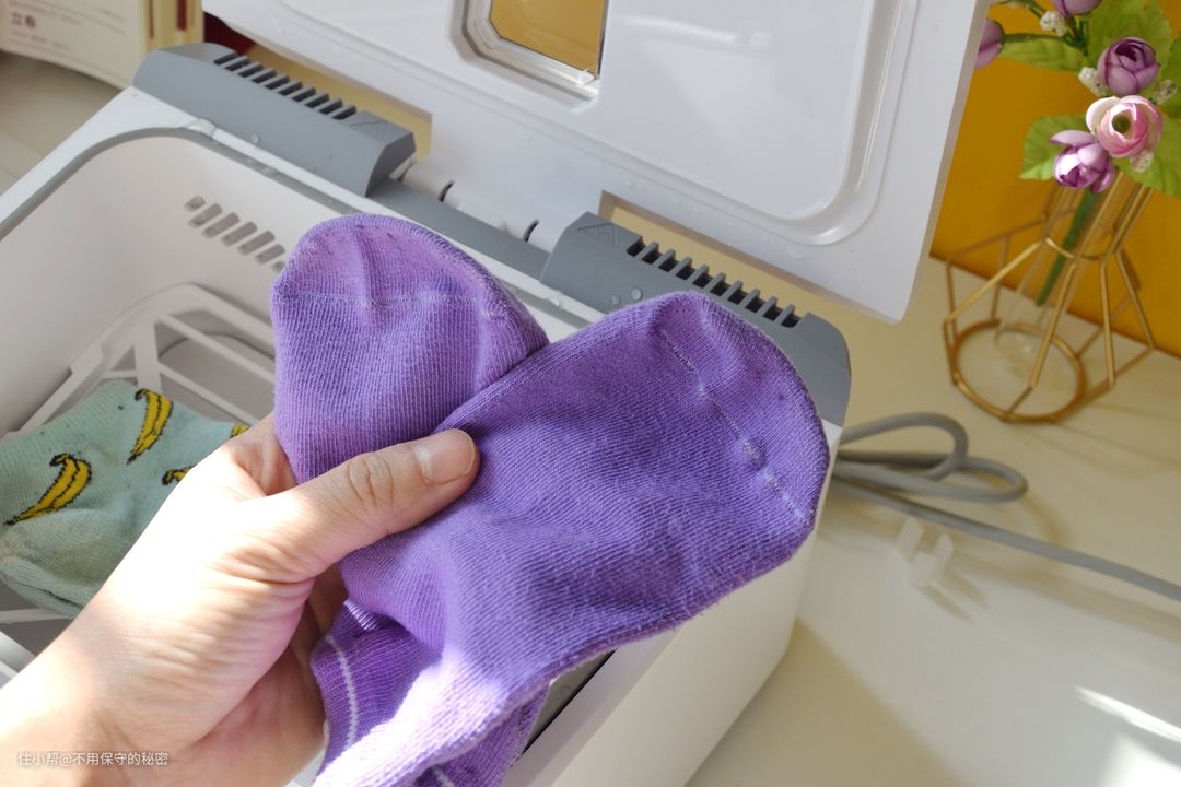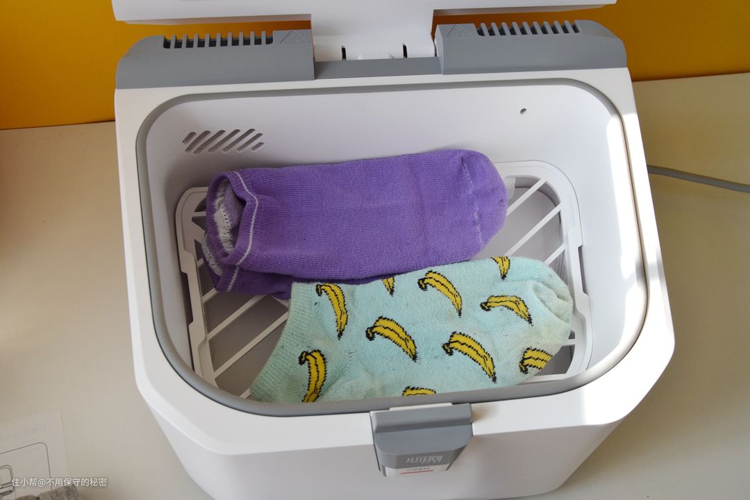 整个机器烘干时声音比较小,放在客厅用,在卧室休息完全不会打扰。平时除了内衣裤、袜子、化妆刷、粉扑等我也会扔进去消毒,使用范围还是很广的。