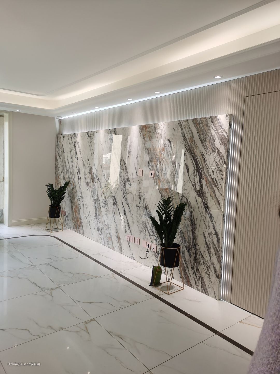来到宽阔的客厅,一个极具现代感的空间尽收眼底。电视墙外贴了天然纹路岩板加强了电视墙的厚重感和时尚感。而电视墙整面墙都是墙板,其中藏了一个我们设计师引以为傲的隐形门设计,使得客厅空间的整体感更强。