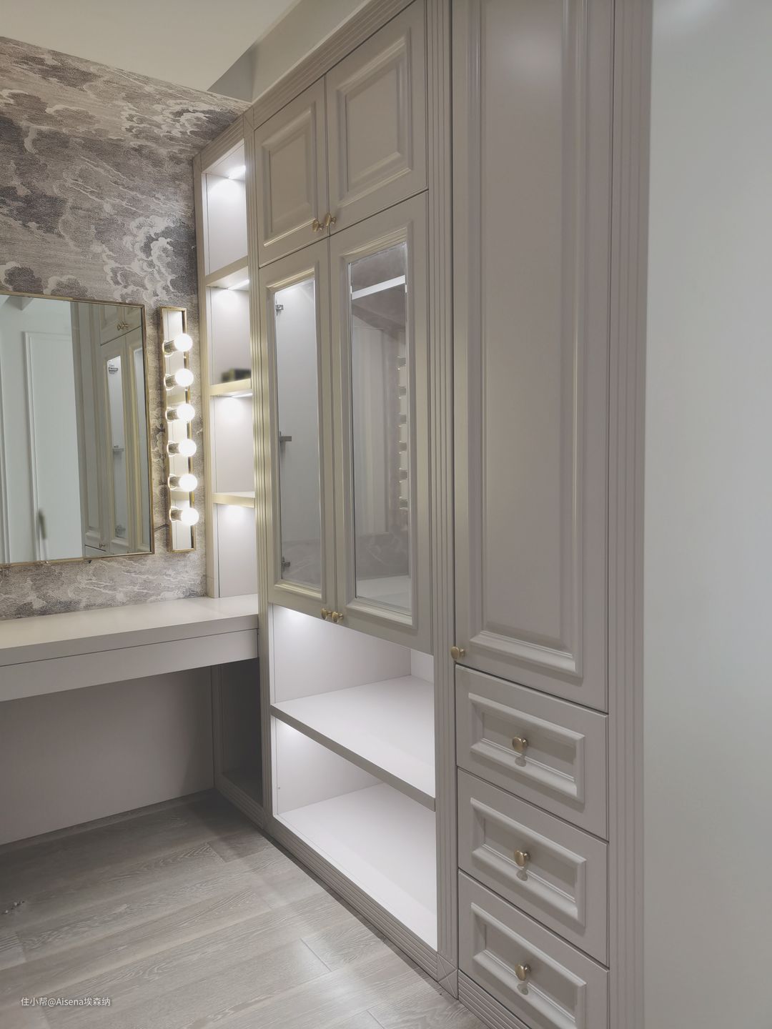 房间内还有一个完成度相当高的创意角落,那就是由过大的主卧空间隔离出来的化妆间。正面有多种储物空间背面有漂亮雕花的大衣柜充当了隔断作用。同时它作为化妆间的衣柜有一个玻璃对开门格子,里面以后会是女主人心爱饰物的家。