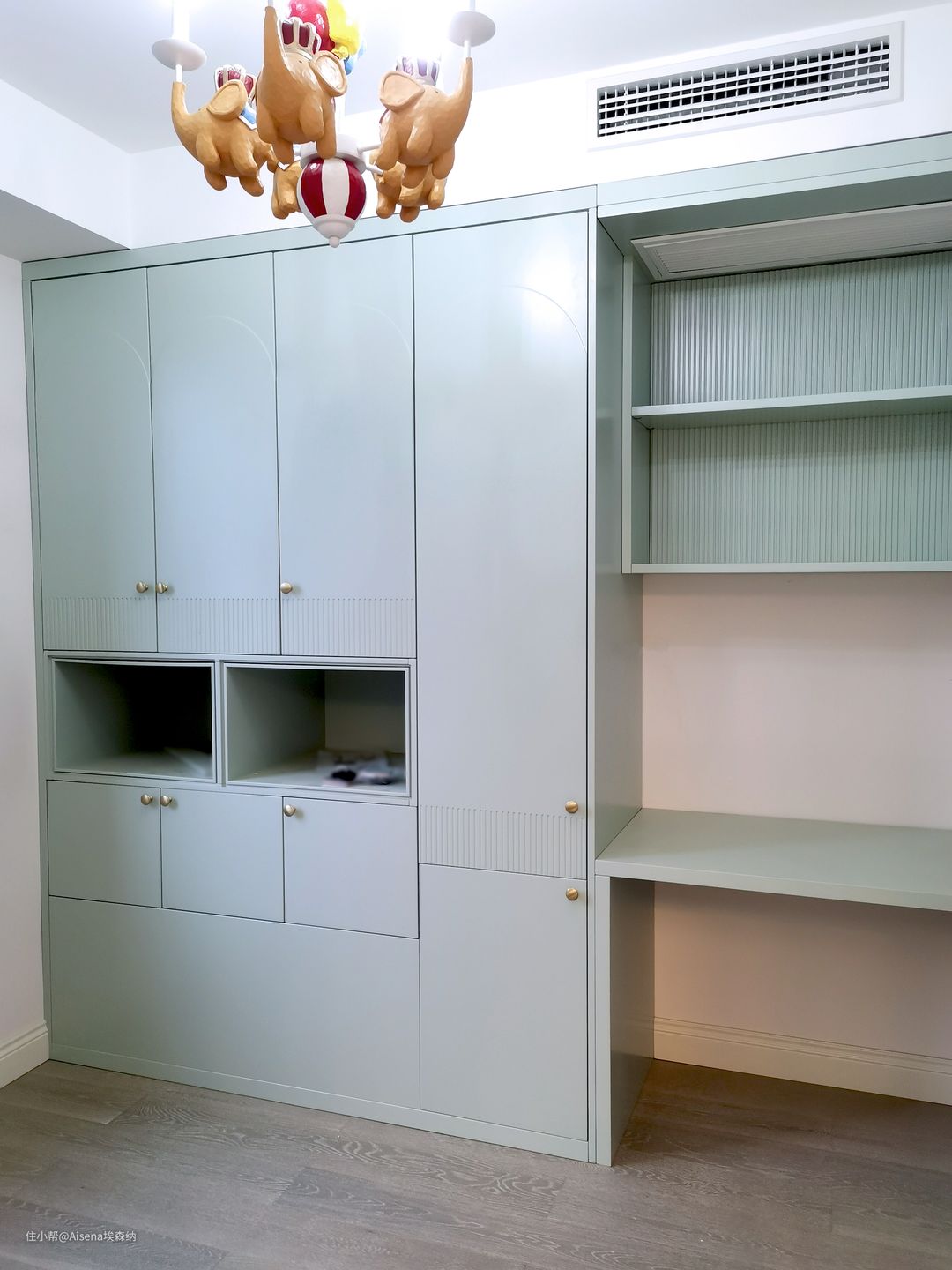 西厨一旁的墙体细看同样有两个隐藏门,它们通往两间保姆房。其中一间完工的保姆房以让人放松的浅绿色作为木作主色调,这是一个贴合天花板的衣柜+书桌组合,虽简单却充满实用细节:衣柜的多种柜格设计使得收纳衣物不再是难事,衣柜的下方因为要放单人床所以设计成了不可打开式,但内部空间依然可以通过上面的柜门来使用;一旁的书柜上方有空调检修口,保证了木作的整体性同时方便修空调的不时之需。