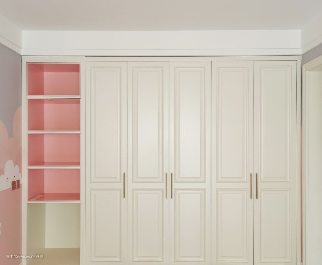 还记得客厅的隐藏门吗?它通向女儿房。进屋即可体会满满的少女心:一整面墙的烤漆大衣柜配套粉色格,简约实用。在女儿房的窗边,有一个默默矗立的百叶门阳台柜,里面装着洗漱用品甚至还有洗衣机,百叶门可以保证柜内透气。而且这个柜子安装相当有难度,边缘需要完全和窗套衔接,对工艺的精准需求极高。