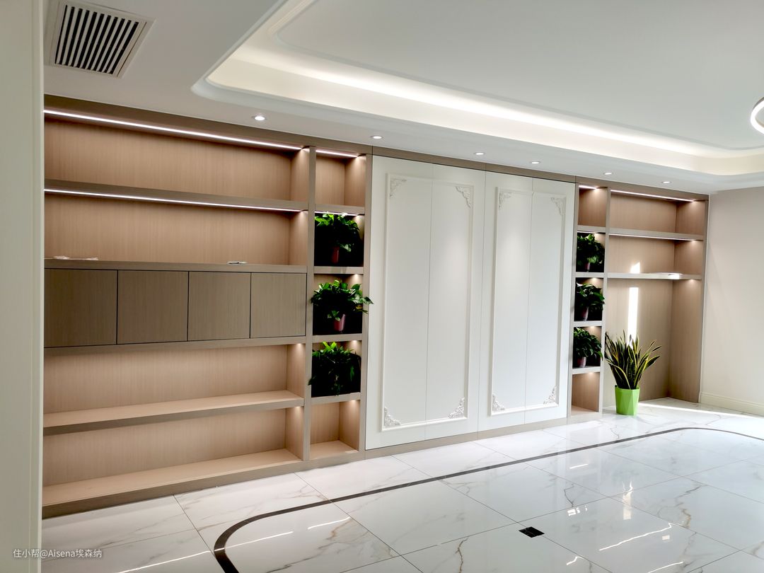 电视墙对面是本次木作设计的一大亮点——一组沙发背景柜,它充分体现了现代人追求的收纳美学。不同高度的开放格既能让孩子们在低处随手拿到她们喜爱的书本玩具,也能让大人们在高处摆好赏心悦目的收藏品,其间还有反弹器柜子适合放一些杂物,甚至有个开放格是留着摆放钢琴的;柜体中央的白色高柜门上有客户最爱的白色雕花。