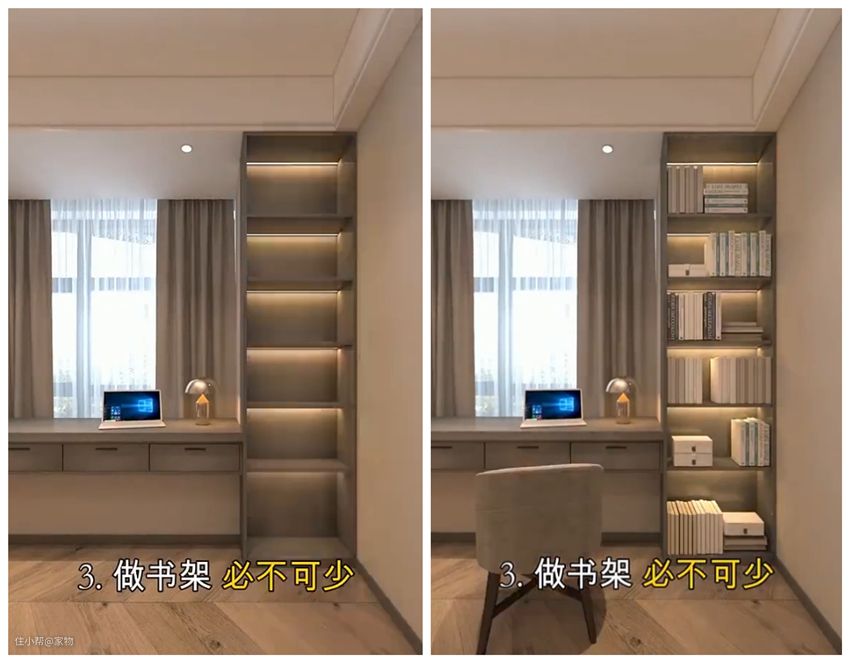 既然把飘窗改成了书桌,那不妨将另一侧做成书架,用来放置图书,充分利用起这面飘窗的冗余空间,同时如果家里没有书房,这样设计更是节约了不少空间~