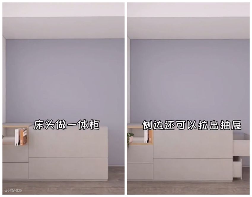 将床头做出一体式的柜子,留出空间设置推拉抽屉,兼顾收纳和日常使用。