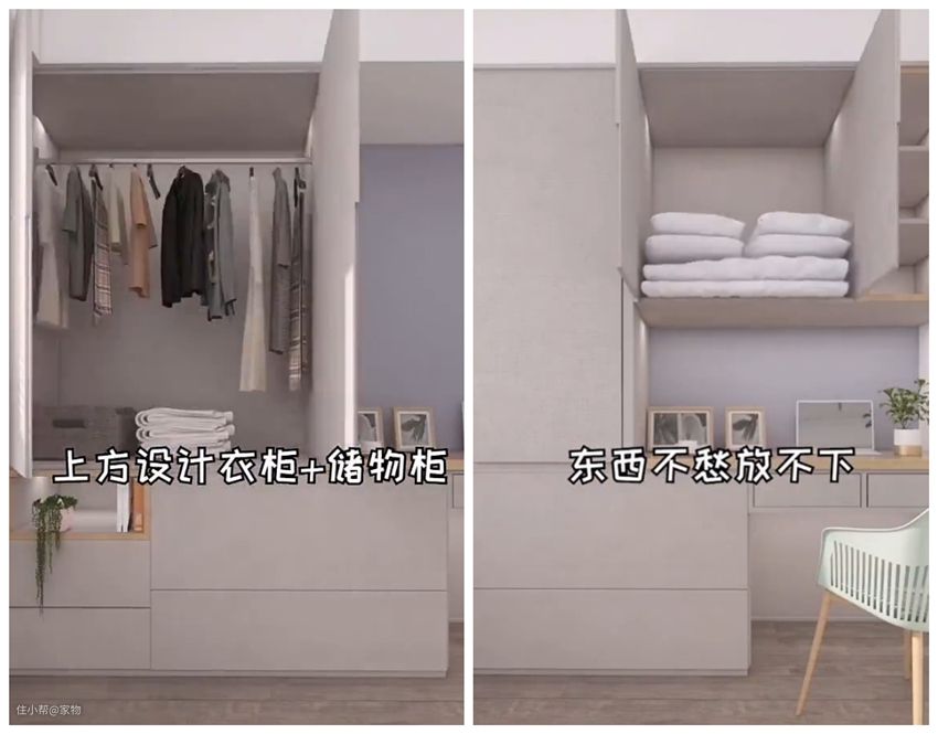 最后,在这面柜体上设计衣柜、吊柜来收纳一些卧室的大小物件,这样下来只用了一面墙,就完成了类似于一体式榻榻米的设计,算是个折衷的方案了!
