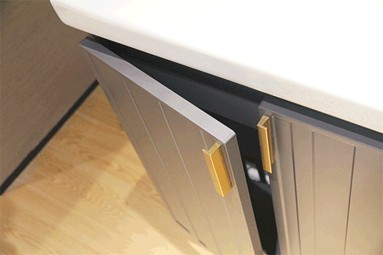 由恒洁木合金打造的浴室柜覆盖轻装、配趣和简悦等多个系列,其中轻装系列有美式质朴、中式雅趣、中式云悦、欧式英伦等四种风格可选,美式质朴采用经典3D设计,低调内敛;以圆形香槟金把手搭配中式秋色调的柜门的中式雅趣,诠释天圆地方理念;以祥云造型和榫接工艺为主的中式云悦,传统韵味十足;哥特式柜脚搭配英式袖口造型把手的欧式英伦,则更显绅士格调。我们可以根据浴室的装修风格亦或是自己的喜好,灵活更换不同风格的门板。