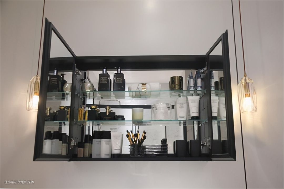 镜柜采用可手动调节高度的玻璃隔板设计,可以将相似高度的护肤品、化妆品等摆放在同一层,亦或是将同功能的洗护用品摆放在同一层,实现物品的灵活收纳和取用;而360°多功能铝镜柜的设计,在梳妆过程中可以多角度的看清自己的面容仪态,满足日常所需的梳妆需求。