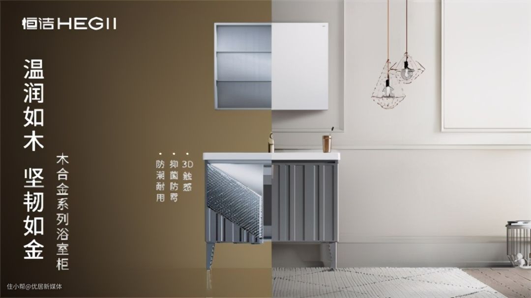 大多数家庭中的卫生间常年处于潮湿阴凉不通风的逼仄环境,这让日常洗漱和储物的浴室柜面临着很多考验,因此,一款品质优良的浴室柜,首要考虑的应当是用材的精良,恒洁木合金系列浴室柜就给出了很好的解决方案。
