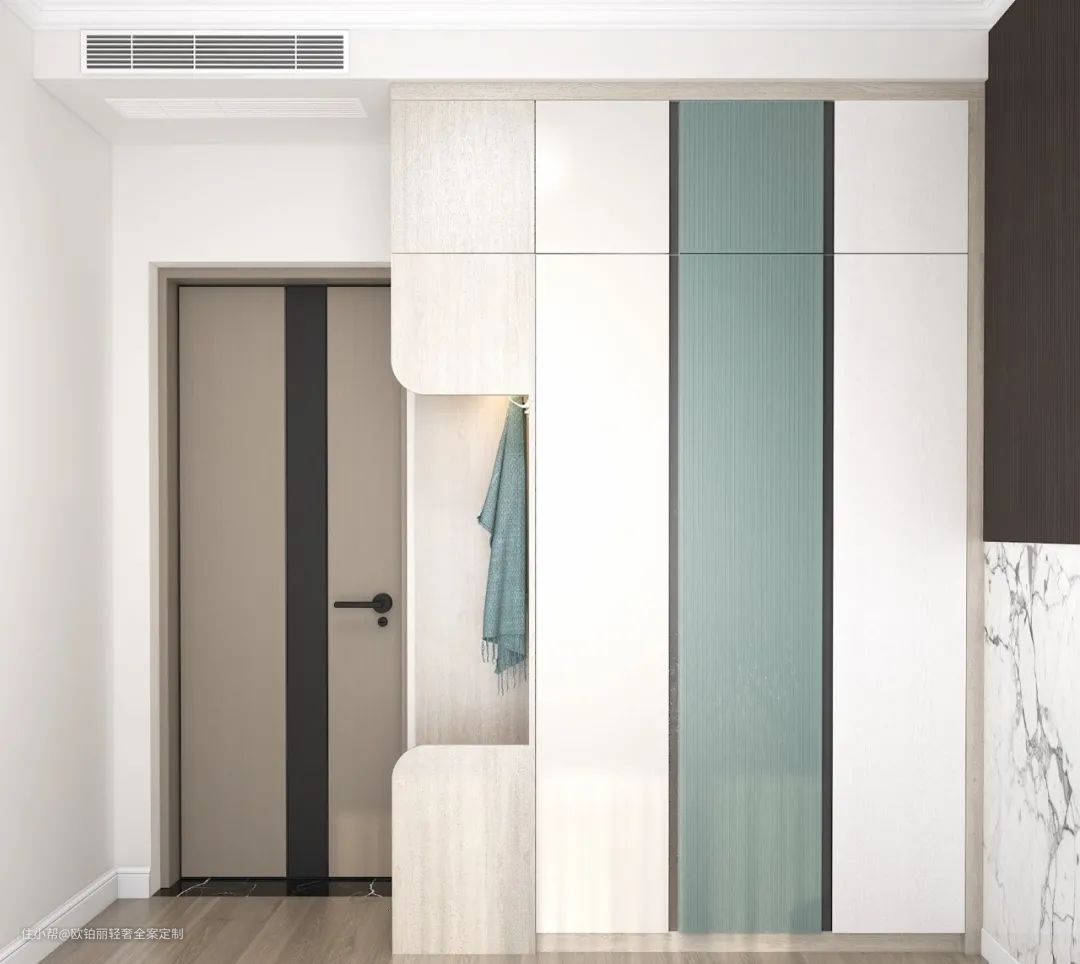 柜门用黛蓝灰与梨花白横竖相间,