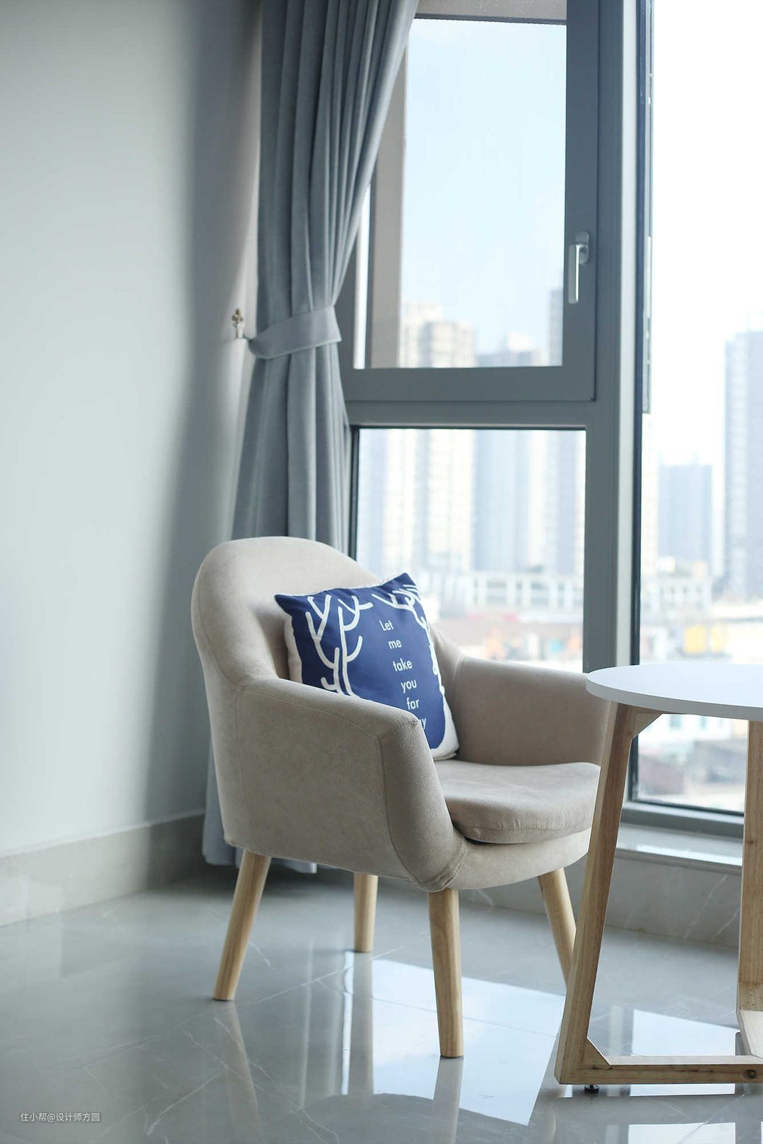 阳台同时也打造了休闲区,一个小边几,两把单人椅,是很好的休憩区域, 城市街景尽收眼中。