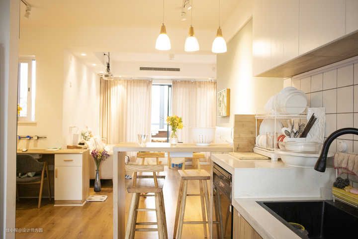 客厅设置折叠式吧台,方便就餐,平时不用也可以收起,不占用室内空间,客厅看起来显大,适合小户型的设计,也适合两人的居住状态。