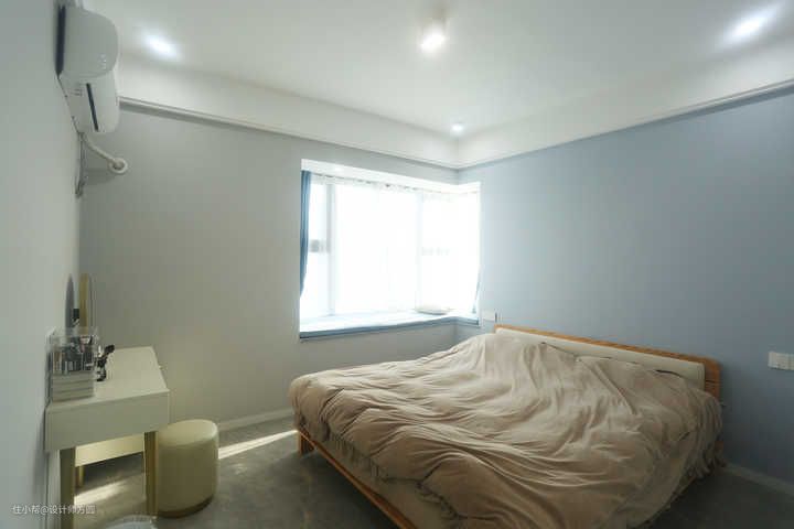 卧室床头背景墙刷了蓝色,其余部分刷了灰色,整体十分清新自然。床尾摆放了梳妆台,飘窗铺设了软垫,便于各种用途的使用。