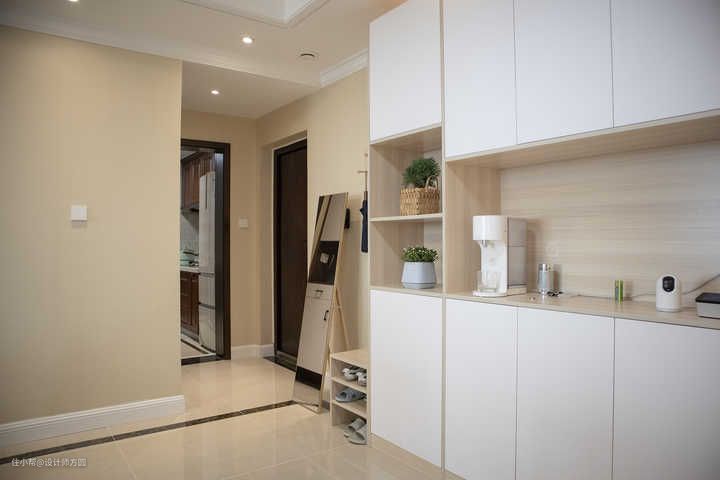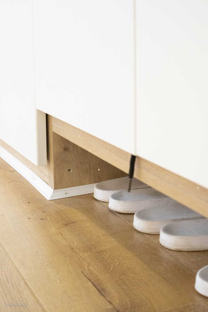 离入户门最近的柜子拿出100cm宽度做了入户玄关收纳。下方留出15cm高度作为换拖鞋的区域。