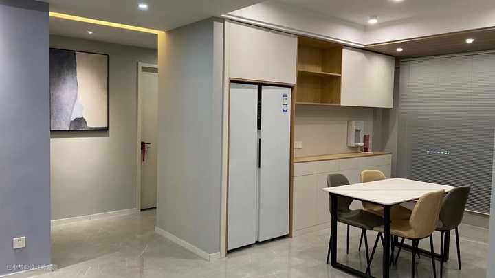 因为厨房的空间比较小,厨房没有房冰箱的空间,空间布局做了改动,把原来卫生间的门口进行移动,在卫生间外面重新砌墙,留出了一个独立朝着厨房的空间,把冰箱嵌入进去,这样冰箱的空间有了,厨房的空间也得到延伸。