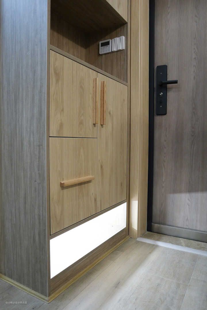 入户门进行更换,入户右手面做了到顶鞋柜,鞋柜底部做了150mm高的镂空,方便放拖鞋等。