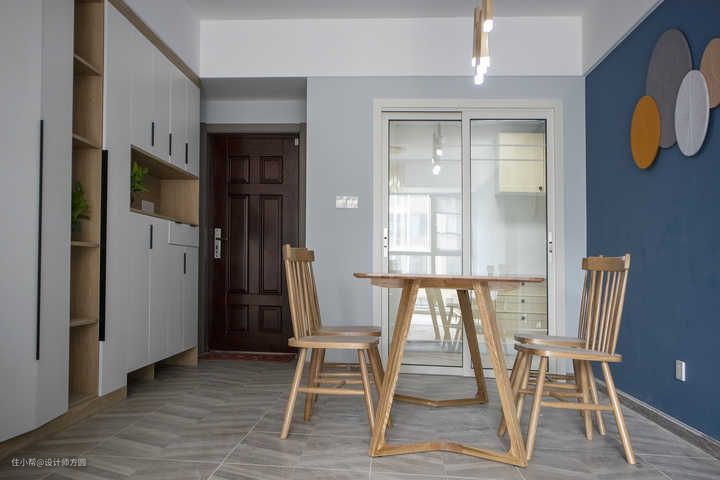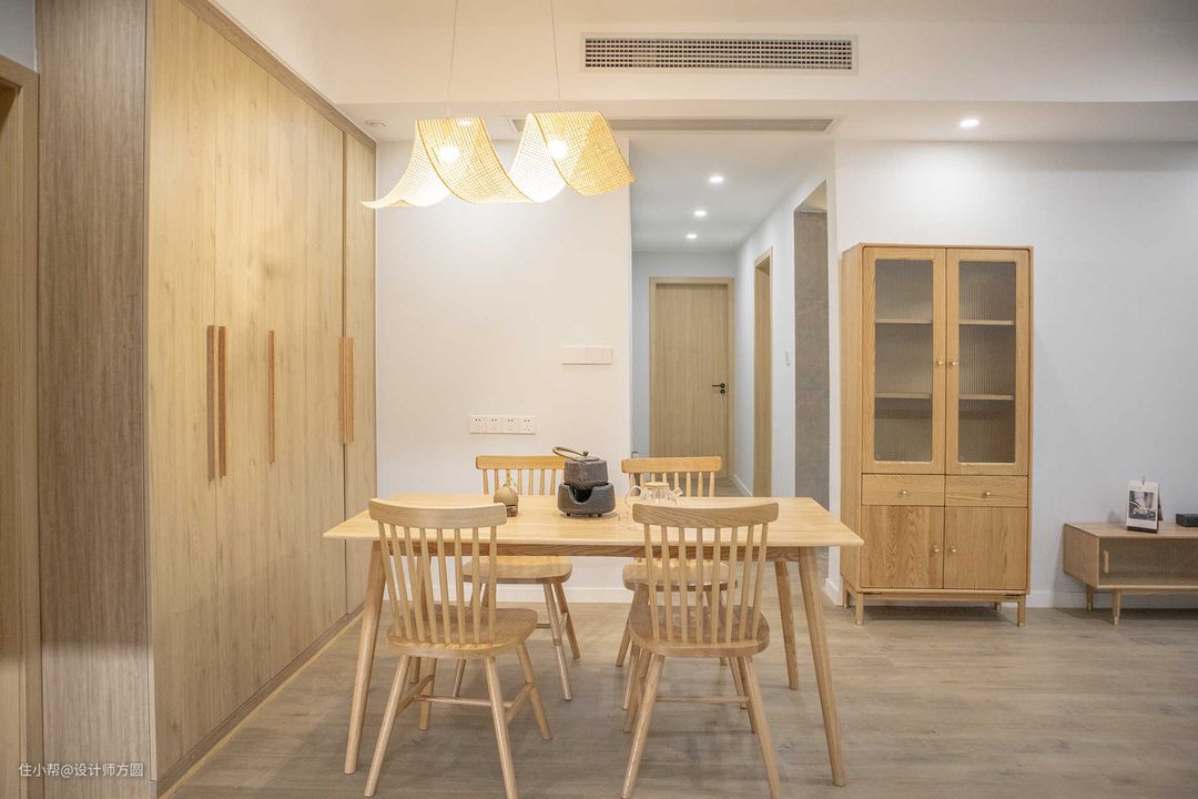 餐厅位置的墙做了整墙的收纳柜,餐桌选用了原木的,和整体的风格相统一。
