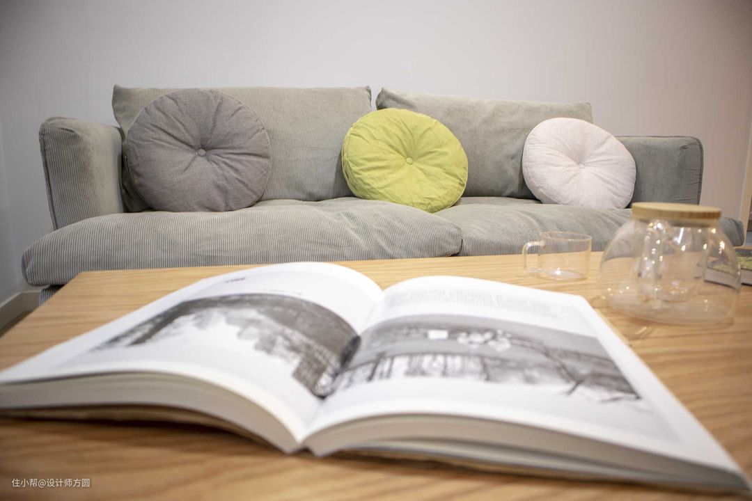 客厅空间的整体色调是灰白和原木色,是当下比较流行的配色,同时又经典耐看,禁得住时间的考验。小空间,配色、材质都不宜超过3种,不然会显得杂乱、压抑。