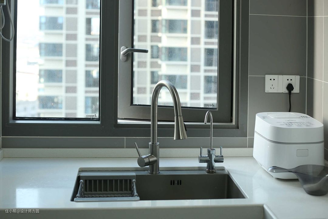 女主人喜欢烹饪,有比较多的小家电,常使用的是面包机,咖啡机,豆浆机,未来可能还有其他小家电,要为他们留固定插座和位置(插座带开关)。 厨房墙面安装了调味盒架子,把调味盒上墙挂起来,使用的时候很顺手。