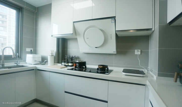 选用了老板抽油烟机和灶具,整体以灰白的搭配为主,呈现简洁干净。