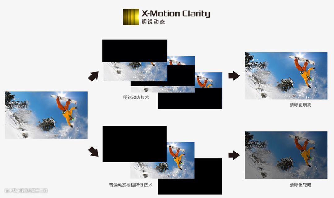 MEMC目前技术也比较成熟,索尼这类老牌厂家也会在MEMC上做更多的优化,自己不少高端的电视已加入明锐动态技术。简单来说可以防止运动场景在MEMC模式下亮度不发生明显减弱,相比普通的运动补偿后的画面体验更好。