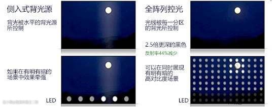 侧入式分区控光呈条状,由于分区较少无法精细调节不同位置的亮度。一般中低端机型采用侧入式分区控光较多。直下式分区控光呈棋盘状,分区较多,不同区域间不容易产生影响,能够独立准确控制每个背光单元,整体的控制能力较精准。一般高端机型都是带分区控光(索尼叫全阵列背光)的直下式设计,整体的画质表现会更加出色。