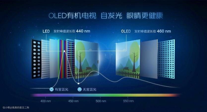 我们都知道部分蓝光对眼睛有害,是否有害主要取决于蓝光的波长。LCD电视的蓝光波长多集中在415-455纳米的区间,短波蓝光较多,能量较强。OLED电视的蓝光波长主要集中在460-480纳米区间,能量相对较低,对人眼的损害也更小。但是考虑到蓝光的数量因素,合格电视产品不管是LCD还是OLED对人眼都没有明显损害。日常观看电视的时候做到保持观看距离和注意间隔让眼睛休息即可。护眼功能更多的是商家的一种噱头,大家了解下即可不用太过在意。