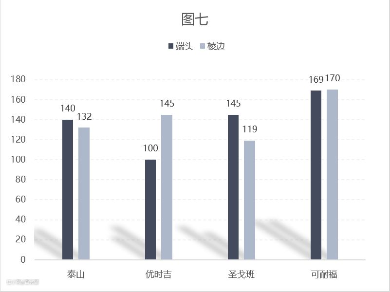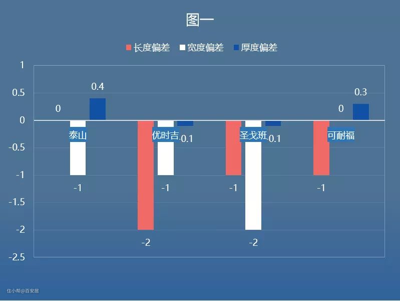 从外观质量和尺寸偏差的检测数据来看,4个品牌均符合国标要求。在长度偏差中,各品牌数据均表现优异,最大长度偏差仅为-2mm;在宽度偏差中,各品牌同样非常理想,数值偏差范围为(0至-2)mm;板材厚度则应坚持“厚板化”趋势,比如泰山在板材厚度上始终保持9.5mm-10mm的生产标准,并在“厚板化”上坚持探索。