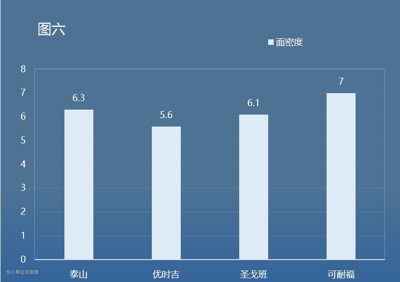 4个品牌纸面石膏板的面密度与硬度的对比数值,泰山的面密度始终维持在6.3kg/㎡ ,优时吉博罗面密度最低,也始终保持在5.6kg/㎡左右,这表明这两个品牌的生产企业的生产、质量管理水平较高,产品工艺较为成熟,可以作为优秀的备选品牌哦!