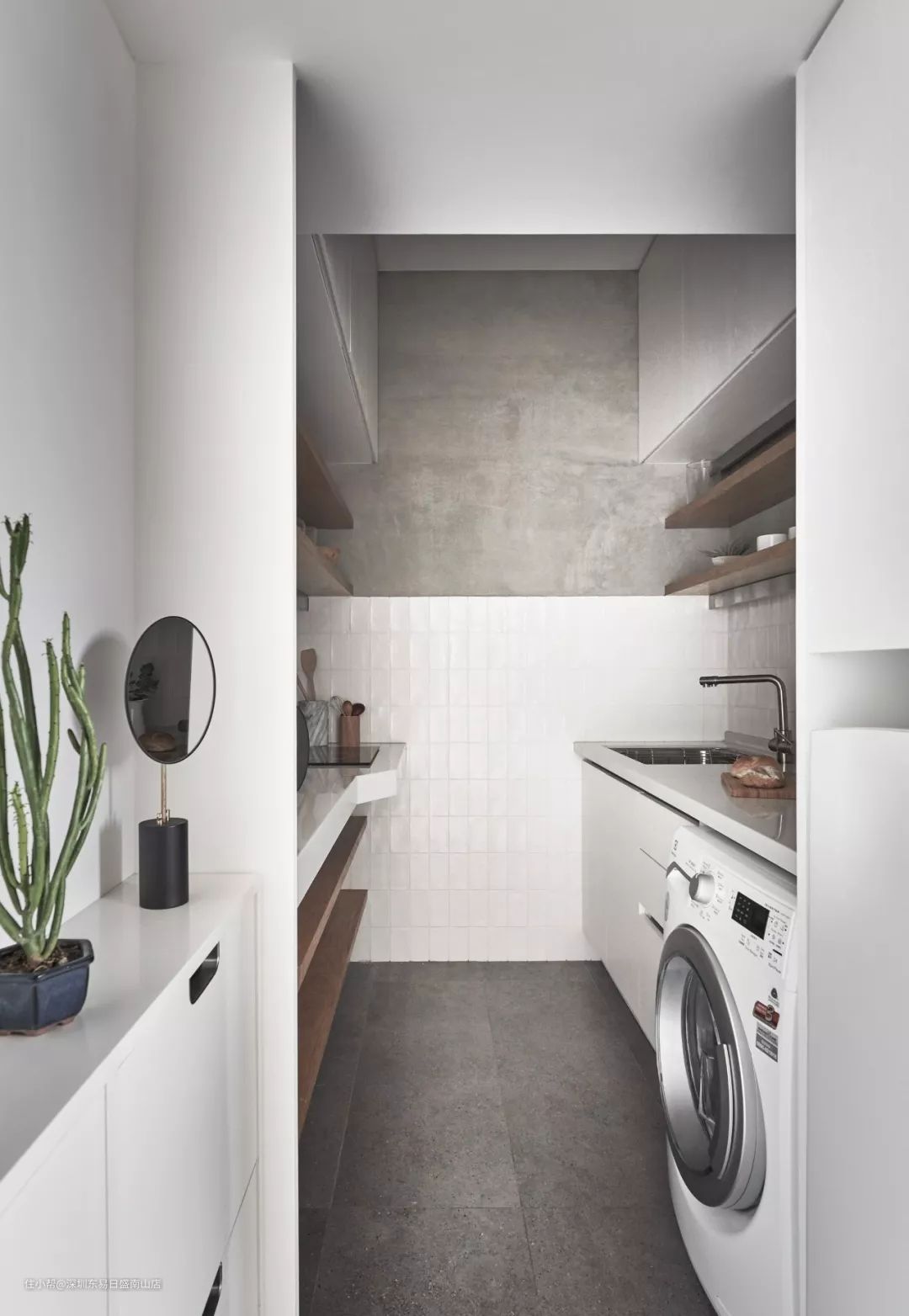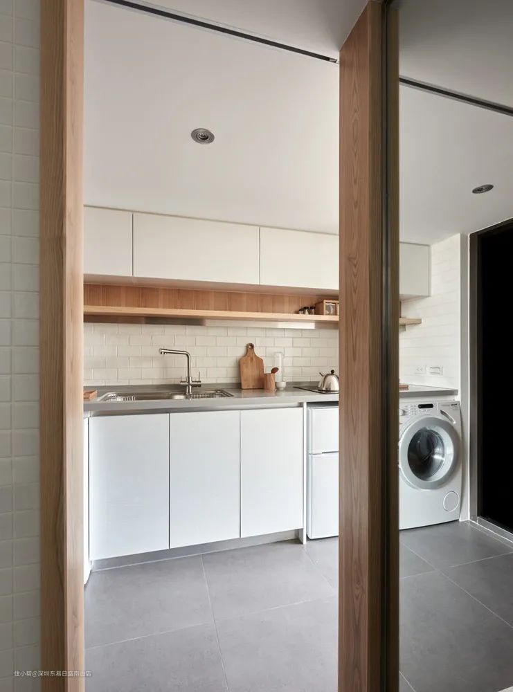 为了给卫生间里的浴缸留位置,洗衣机直接放在厨房里,陷入到台面下,也不会有什么存在感。