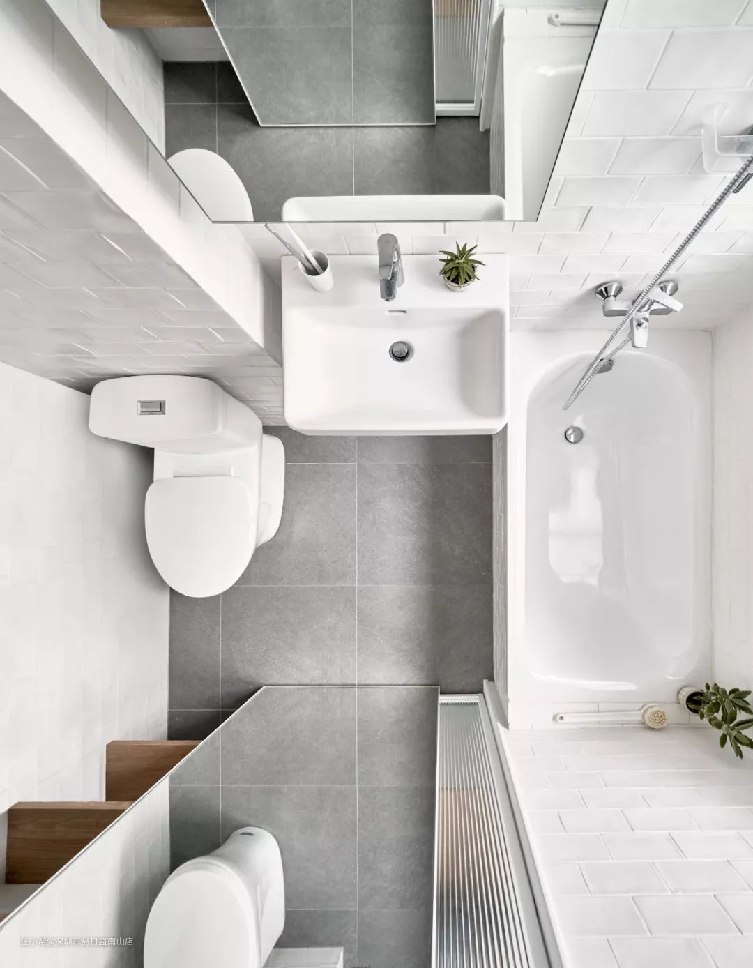 从右到左,依次是浴缸、洗漱台、马桶,给浴缸加一层浴帘就能实现干湿分离了。