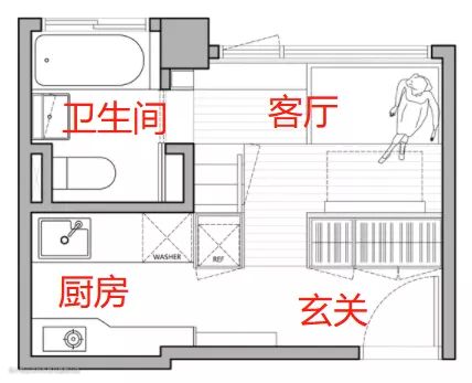 如此小户型公寓在“收纳”和“便利”之间,只能优先考虑收纳了,聊胜于无,上方吊柜可选择储存不常用的物件。
