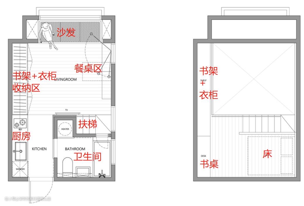 虽然面积狭小,不过20㎡,不过对于很多loft来说,尤其是出租用的loft公寓,往往会追求空间通透显大而忽略收纳设计。