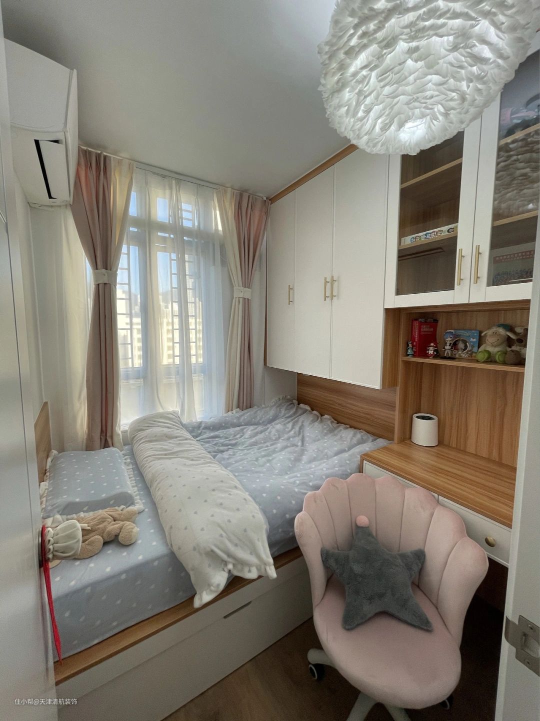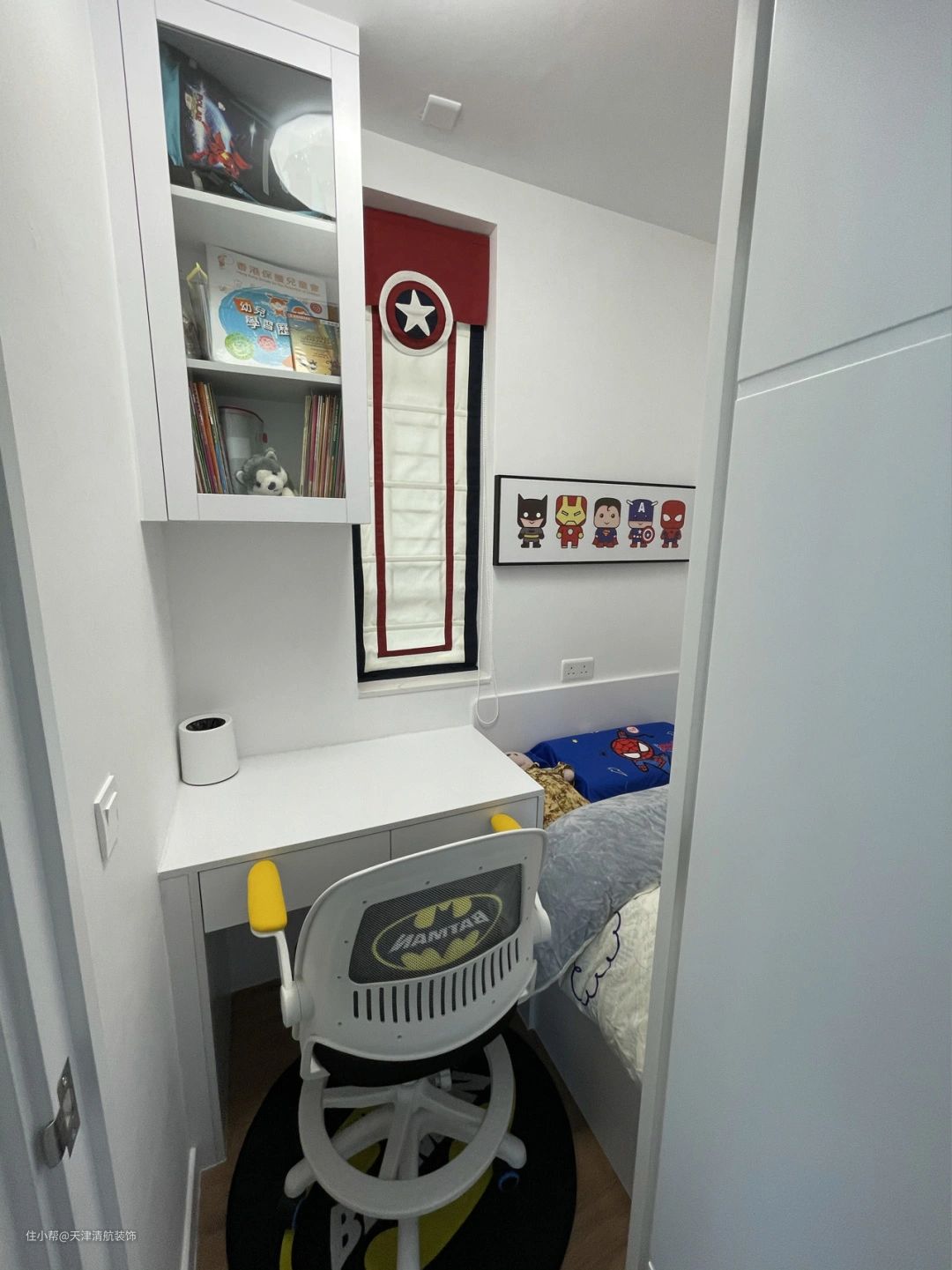 小孩房的空间基本大小也是一样的,打开门就是这样的视角,正对着书桌柜,可以非常方便屋主家的小孩写作业或者看书。