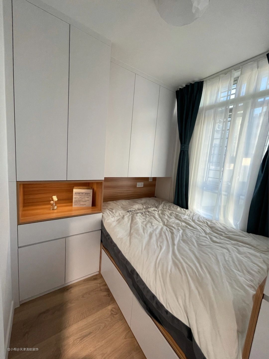 还有另外一间房也是定制了榻榻米,一家三口一个一间房,互不影响。都是定制了榻榻米,榻榻米床放着坐垫,坐着特别舒服。柜体和柜门颜色不一样,显得比较好看。柜门选择白色,在视觉上,小小空间也显大,不会让人觉得有压抑感!