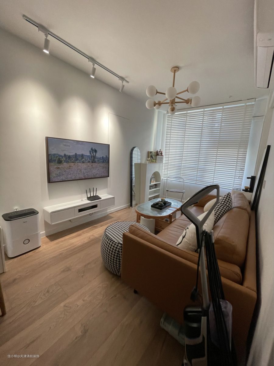 这是客厅,没有做电视墙,不过设计了隐形门,显得比较隐蔽。只有36平的面积,不适合做吊顶,更不适合做其他复杂的造型。电视机直接挂在墙上,比放在电视柜节省空间,刚安全。电视柜是悬空的做法,方便做保洁。布置了双人棕色皮革沙发,坐着很舒服。一家人坐在沙发看看电视,或者聊天,都是一种享受,享受香港带来的生活中的福利!安装的吊灯很喜欢,为了增加更多照明,安装了射灯,刚好可以照电视墙这边,效果还不错。